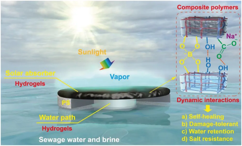 水资源短缺是当今世界面临的主要挑战之一。由于地表水和地下水仅占地球所有水的0.01%,开发和利用海洋水资源受到研究人员极大的关注。众所周知,海水含盐量高,无法直接饮用。虽然出现了一些海水淡化技术(例如,蒸馏、反渗透、正向渗透和电渗析),但这些方法进行海水淡化时需要耗费大量的能源和使用成本极高的机器。太阳能是取之不尽的能源,利用太阳能将淡水与盐分和其他污染物分离的技术称为太阳能蒸馏。传统的太阳能蒸馏器由一个装满水的黑色底盆和一个作为冷凝器的透明盖组成,其产量和光热效率较低。最近,太阳能驱动的界面蒸发已成为一种用于高效、清洁水生产的创新和可持续技术。太阳能界面蒸发器的使用环境是需要重点考虑的因素,比如开放水域和动态环境(海水域、水库等)中的水波不可避免地会对界面蒸汽发生器的刚性和脆性结构元件造成物理损坏。尽管基于天然和无机/有机混合材料的界面蒸汽发生器提供了良好的机械强度和抗钝性损坏,但它们容易受到一些机械损坏(如切割、撕裂和摩擦)。小的物理损伤的逐渐增长往往会降低材料的性能并最终导致整个设备的故障。这无疑给耐损伤材料的设计带来了挑战,并在界面蒸发生器中使用的材料的机械强度和柔顺性之间产生了两难选择。受生物体自密封和自修复过程的启发,不同的仿生设计和机制已被转移到自修复聚合物网络(水凝胶、弹性体、热固性材料等)中,旨在损坏和疲劳后恢复功能。然而,在目前界面蒸发生器的设计中,结构部件的可重复性(疲劳)和可逆性(恢复)在很大程度上被忽视了。因此,亟需开发自修复构件来防止永久性故障、恢复原始功能并延长使用寿命的界面蒸发器。