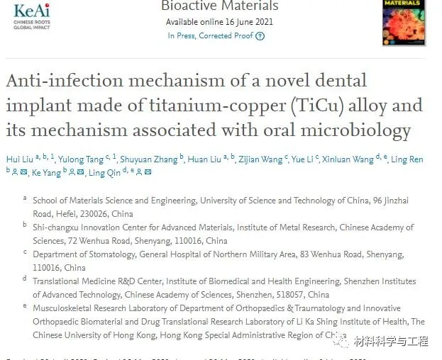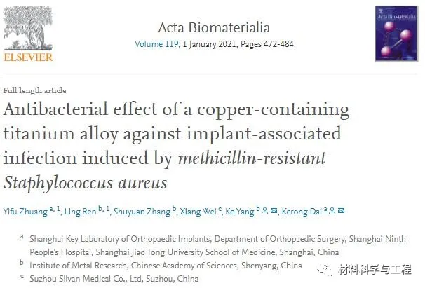医用金属材料(钛合金、不锈钢、钴基合金等)因具有优异的综合力学性能、加工成形性能和临床使用的可靠性,在骨科、齿科、管腔支架等临床领域获得大量应用,如心血管支架、骨折固定器械、人工关节、脊柱矫正、牙种植体等。随着我国逐渐步入老龄化社会,心脑血管疾病、骨质疏松性骨折、牙缺失等问题日益增多,用于人体组织器官修复和替换的金属医疗器械扮演着不可替代的重要角色。然而,医疗器械引发的细菌感染问题已成为临床上长期存在的痛点问题。针对金属植入器械引发感染的重要临床问题,中科院金属所杨柯、任玲研究团队提出了发展抗菌医用金属的创新思想。近期,团队研发的抗菌Ti-Cu牙种植体、抗菌Ti6Al4V-Cu骨折固定器械在口腔、骨科等领域中的应用研究取得重要进展。