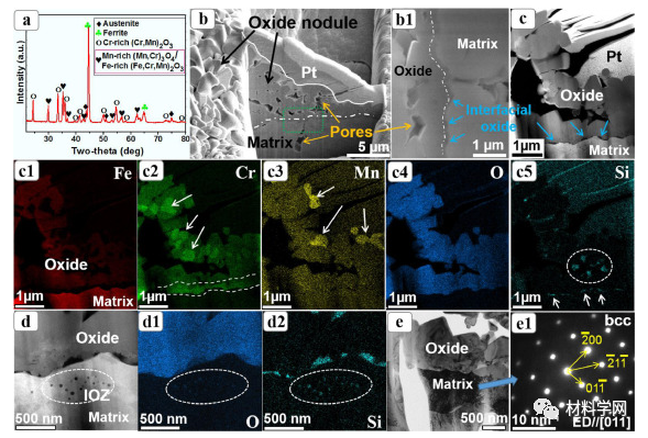图2。(a) CG-304-2 在 900 °C 下等温氧化 1440 分钟的 XRD 图。(b) 球状氧化物的横截面 SEM 形貌,放大图显示 (b1) 中的方框区域。(c) 结节状氧化物的扫描透射电子显微镜-高角度环形暗场 (STEM-HAADF) 图像和 (c1 c5) 相应的EDS映射。(d) 结节/基质界面区域的 STEM-HAADF 图像和 (d1 d2) 相应的 EDS 映射。(e) 界面区域的 STEM-明场 (BF) 图像和 (e1) 界面下方粗基体晶粒的选区电子衍射 (SAED) 图案。