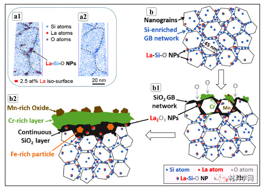 图 5。(a1) Si、La 和 O 的组合原子图和 (a2) Si 原子图的APT结果。(b) NC-304 的微观结构配置示意图,其 GB 装饰有 La-Si-O NPs 和隔离的 Si 原子。连续SiO 2愈合层的形成机制示意图:(b1)在纳米级GB 网络中快速形成SiO 2 ,(b2) 纳米晶基体晶粒的解离和伴随的连续SiO 2愈合层的形成。