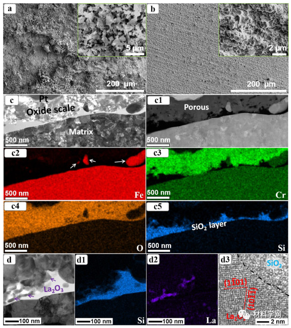 图 4。CG-304 和 NC-304 在露天炉中在 1000°C 下等温氧化 1440 分钟的氧化皮的微观结构和组成。(a) CG-304 和 (b) NC-304 氧化皮的表面 SEM 形态。(c) STEM-暗场 (DF) 图像,(c1) STEM-HAADF 图像和 (c2 c5) NC-304 氧化皮的相应EDS映射。(d) 氧化物/基质界面区域的 STEM-HAADF 图像和 (d1 d2) NC-304 的相应 EDS 映射。(d3)在 NC-304 中掺入无定形 SiO 2的纳米颗粒的 HRTEM 图像。