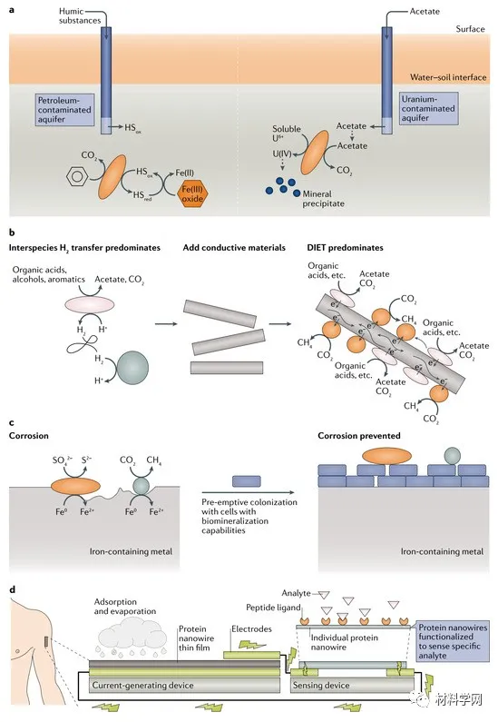 近日,我校材料学院电活性生物材料研究所戴瑞克·拉夫莱教授在国际顶级刊物Nature Review Microbiology(影响因子60.6)发表题为《Electromicrobiology: the ecophysiology of phylogenetically diverse electroactive microorganisms》的综述性文章(Nat. Rev. Microbiol., 2021, https://doi.org/10.1038/s41579-021-00597-6)。该论文重点阐明电活性微生物的生理学和系统发育学多样性、电活性微生物群落的细胞外电子传递机制、以及电活性微生物研究在新材料等领域的潜在应用。如图1所示,电活性微生物可应用于环境修复(图1a)和生物能源领域(图1b)。相关研究还为金属材料的腐蚀与防护提供了新的思路(图1c)。拉夫莱教授团队最近发现微生物具有宏量生产导电蛋白纳米线的特性,充分挖掘了其蕴藏在生物器件领域可待开发的巨大潜力(图1d)。导电纳米线这种电活性生物材料具备独特的功能,可广泛应用于生物医疗、环境监测、能源再生、生物兼容性电子器件等领域。