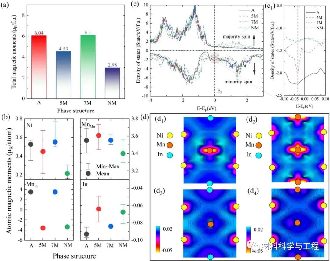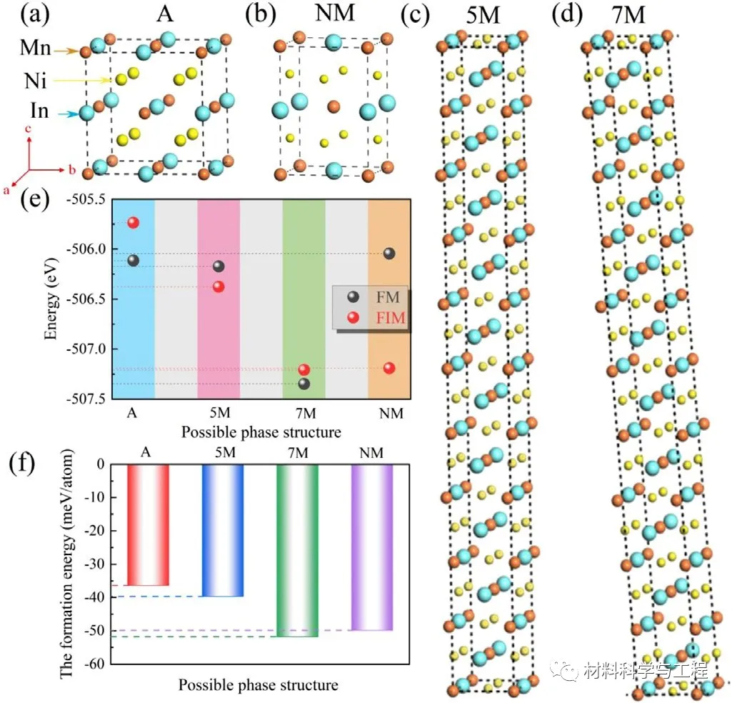 研究发现具有亚铁磁性(FIM)的5M和NM马氏体的能量低于其FM态的马氏体,其他相正好相反。这表明奥氏体(A)和7M相表现出铁磁性,而5M和NM马氏体是亚铁磁性。通过计算得知形成7M马氏体所需能量低于5M和NM马氏体。这意味着5M马氏体是亚稳态相,而7M马氏体是热力学最稳定的相。一般认为调质马氏体有很大的趋势最终转变为NM马氏体。