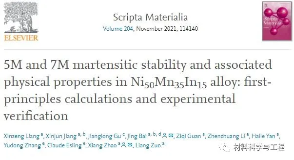 来自东北大学,燕山大学等单位的研究人员通过第一性原理计算和实验研究了Ni50Mn35In15合金中5M和7M调质马氏体的相稳定性和相关物理性能,可以根据状态密度和微分电荷密度分析来确定相的稳定性。相关论文以题为“5M and 7M martensitic stability and associated physical properties in Ni50Mn35In15 alloy: first-principles calculations and experimental verification”发表在Scripta Materialia。