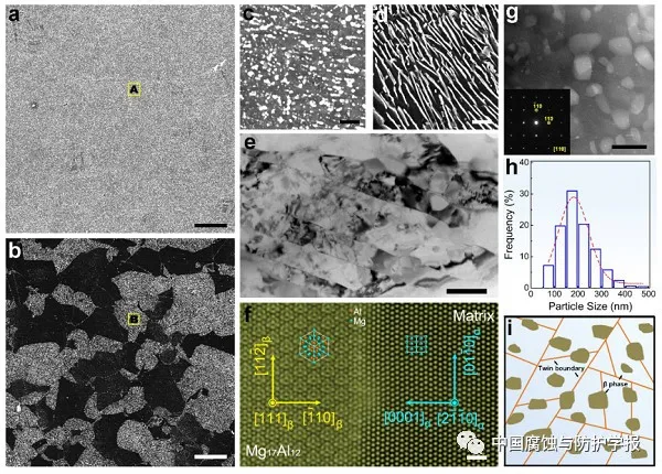 近日,金属所中科院核用材料与安全评价重点实验室许道奎研究员团队与南京工业大学信运昌教授课题组合作在制备高强高耐蚀镁合金材料方面取得重要进展。他们采用多道次三向压缩技术制备孪晶组织,通过对压缩路径及道次应变的独特设计,利用12道次低应变和高应变循环交替压缩,在AZ80镁合金中成功地制备出平均片层厚度约为200 nm的高密度孪晶组织,使平均晶粒尺寸从初始材料的33 mm左右细化至300 nm,其抗拉强度高达469 MPa,是已报道该系列镁合金中强度最高的。利用高密度超细孪晶组织细化晶粒,不仅避免了非平衡晶界对耐腐蚀性能的不利影响,而且改变了β-Mg17Al12相的形貌及分布。β-Mg17Al12析出相呈颗粒状,细小且均匀分布在镁基体中,显著抑制了局部腐蚀的发生,将腐蚀速率降低了一个数量级。该研究成果以“Evading strength-corrosion tradeoff in Mg alloys via dense ultrafine twins” 为题发表在《自然·通讯》(Nature Communications)上。