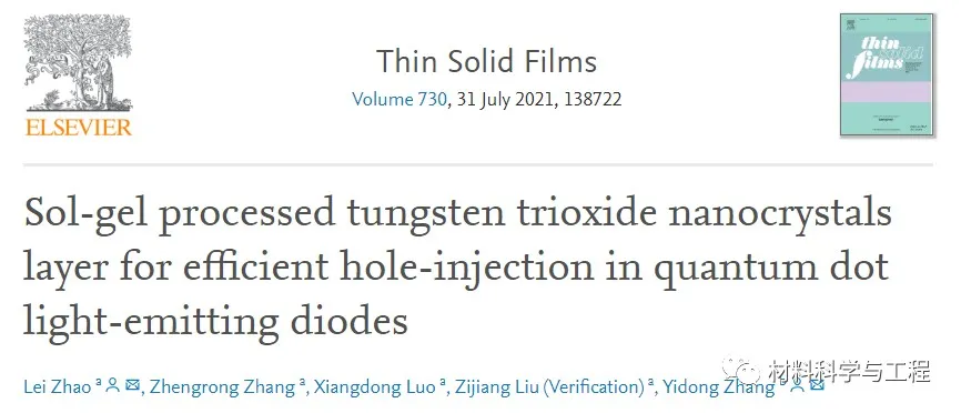 稳定性是限制QLEDs实际应用的最重要因素。研究人员一直在寻找更稳定的阳极界面材料。来自兰州城市学院和许昌学院的研究人员报道了以三氧化钨(WO3)纳米晶(NCs)薄膜作为空穴注入层(HIL)的高亮度高效量子点发光二极管。WO3薄膜致密光滑,有利于在绿色QLED中形成HIL。QLED的亮度、电流效率和工作寿命为18560 cdm?2,11.8 cd A?1和11844小时。相关论文以题目为“Sol-gel processed tungsten trioxide nanocrystals layer for efficient hole-injection in quantum dot light-emitting diodes”发表在Thin Solid Films 期刊上。
