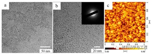 图1.石英衬底上WO3 NCs(b)和SAED(插图b)的TEM图像(a)、放大TEM图像,以及WO 3 NCs(c)的AFM图像。