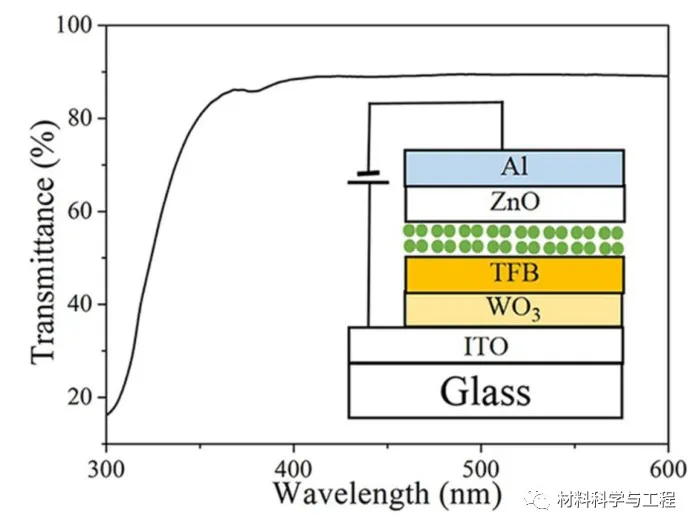 图2.石英衬底上WO3纳米晶的光透射光谱,以及插图是基于WO3 NCs 的QLED示意图。