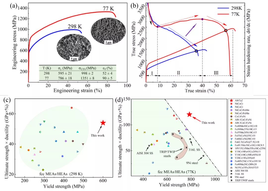 导读:低温工程应用非常需要具有出色低温机械性能的金属材料。本文通过化学成分设计和热机械加工,开发了一种新型 (NiCoCr) 92 Al 6 Ta 2中熵合金 (MEA),以实现优异的低温机械性能。看来孪晶 (NiCoCr) 92 Al 6 Ta 2 MEA 表现出强烈的温度依赖性机械行为,即当测试温度从 298 降低到 77 K 时,屈服强度、极限强度和拉伸延展性分别从 600 MPa 增加到 800 MPa、1.0 到 1.35 GPa 和 52% 到 90%。该合金实现了优异的强度-延展性协同作用和非凡的应变硬化能力,特别是抗拉强度和伸长率的乘积更优于报道的同类产品。