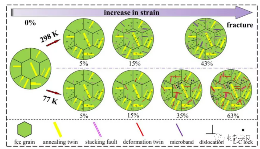 图 9 示意图分别说明了 (NiCoCr) 92 Al 6 Ta 2 MEA 在 298 和 77 K 下的变形机制转变和变形微观结构的特征。