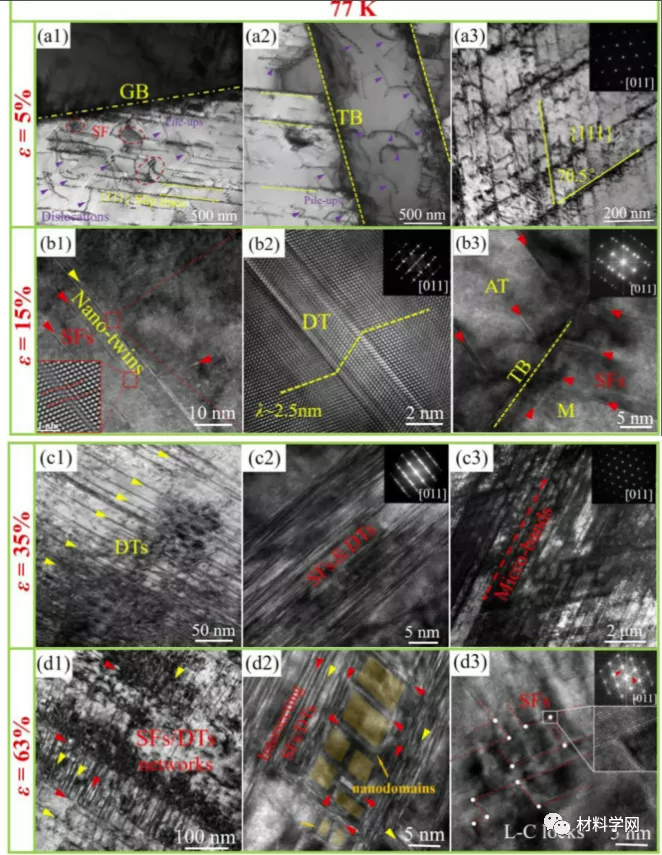 图 7。(NiCoCr) 92 Al 6 Ta 2 MEA 在 298 K 下的典型变形子结构显示了具有不同间断应变(a/5% 和 b/43%)的微观结构演变。(a1) {111}滑移轨迹上的位错滑移(以黄线标记);(a2)和(a3)GB和退火TB的位错堆积,以及平面全位错(用红色平行线标记);(b1) 沿{111}系统的HDDWs形态;(b2) 具有高密度位错的应变诱导微带;(b3) SF 的特征和与 FFT 模式相关联的 SF 的放大图像。