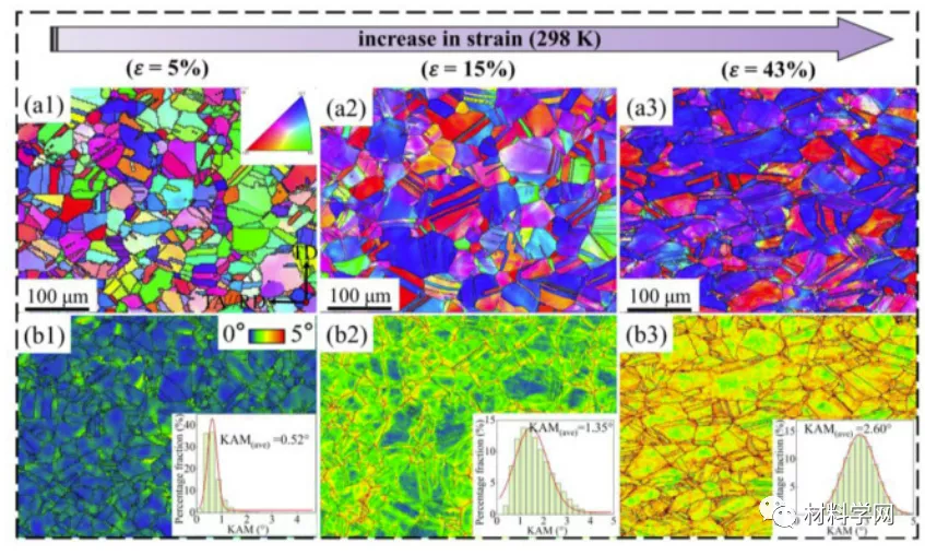 图 4。(NiCoCr) 92 Al 6 Ta 2 MEA 在 298 K 下具有不同应变水平(真实应变:5%、15% 和 43%)的变形微观结构演变的 EBSD 表征。(a1)-(a4) IPF 图,显示张力期间优选取向的发展;(b1)-(b4) 相应的 KAM 映射和 KAM 值统计结果的插图,这意味着 GND 的密度增加。