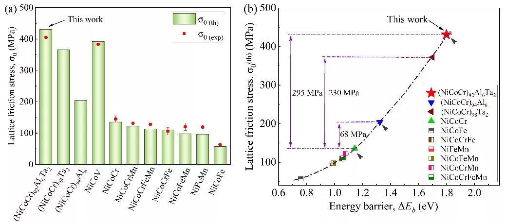 图1. Al/Ta合金化效应显著提高基体NiCoCr合金晶格摩擦力