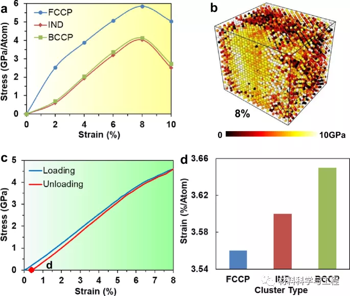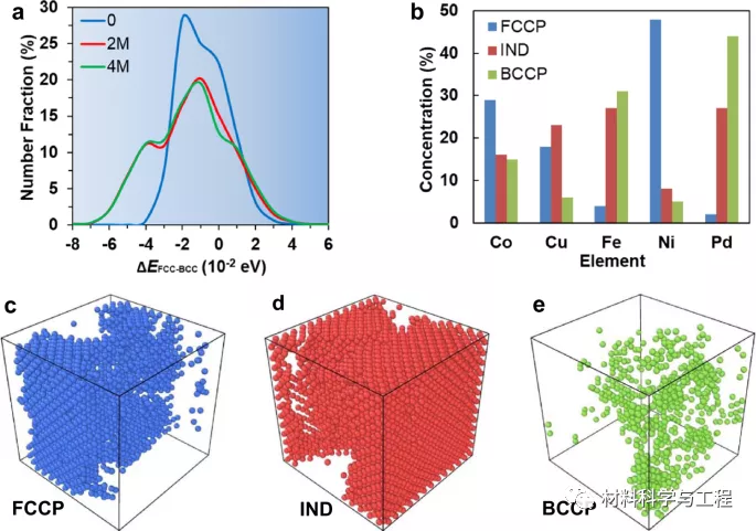 综上所述,研究者进行了迭代MC和MD模拟,来检验SRO在CoCuFeNiPd HEA中的演变,并进行MD模拟来研究SRO对力学行为的影响。在SRO形成过程中,一小部分区域转变为BCC-优选结构(BCC比FCC更稳定),另一部分区域转变为非常强烈的FCC-优选结构(FCC比BCC更稳定)。由此得到的结构是由边缘稳定的基体中非常稳定的FCC-优先(FCCP)区域和BCC-优先(BCCP)区域组成的伪复合组织。拉伸变形模拟结果表明,SRO的发展提高了HEA的极限强度和延性。这些增强的来源可以追溯到SRO诱导形成的伪复合组织;这包括边缘相稳定的基体中的FCCP硬化域和BCCP增韧域。