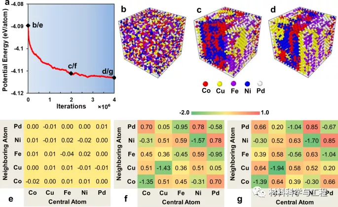 图1 CoCuFeNiPd HEA在300 K迭代期间的势能、原子构型和Warren-Cowley参数。
