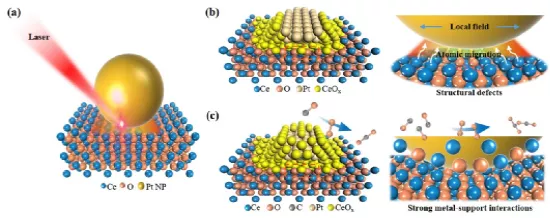 在这一工作中,以Pt/CeO2这一体系作为主要研究对象。研究发现,激光辐照过程中Pt和CeO2界面的电场强度明显高于其它地区,这表明纳米约束电场在SMSI的形成过程中发挥着关键作用。在局部场激发下在CeO2载体表面形成了缺陷和亚稳态CeOx物种,同时在激光的诱导下亚稳态CeOx向Pt颗粒迁移,并在表面形成几个原子层厚的非连续多孔包覆层。由于包覆层的多孔特性,使催化剂具有更好的催化活性和稳定性。利用超快激光这一策略,我们也在其它负载型贵金属体系如Au/TiO2、Pd/TiO2、Pt/TiO2、Pt/Al2O3、Au/MgO、Pt/SiO2普适性的实现了SMSI效应,为构筑金属-载体相互作用开辟了一条全新的思路。