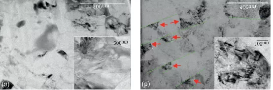 从力学曲线可以看出梯度结构设计对于提高镁合金综合性能的优势。更重要的是,必须深入揭示结构化 GS 镁合金中相应的微观结构特征,以探索设计先进结构材料的新机制。为此,我们表征了单轴准静态拉伸后每层 GS Mg 合金的微观结构演变。在图 3a 中,TEM图像显示了单轴拉伸后FG区域中超细晶粒的显微组织形态。与拉伸前的小尺寸DRX晶粒类似,变形晶粒内部几乎没有微观结构缺陷,但晶界变得相对不清楚。这应该与用于适应UFG Mg或其合金的塑性的晶界滑动。此外,高倍TEM图像插图显示稀疏晶粒内部存在一些平面缺陷。图3b是在孪晶区域内通过FIB技术切割的TEM样品上捕获的。引起的喷丸硬化一些预先存在双胞胎(参见图1 c)中消失,而产生大量的超细晶粒。这些晶粒可能是由孪晶界之间的位错分裂产生的。在图3的TEM图像中可以找到一些条状晶粒(用红色箭头标记)湾,并且在一些较小尺寸的细分晶粒中存在更高密度的缺陷。如图3上方插图所示b、存在许多相交的堆垛层错和位错相互作用。这有助于理解镁合金自支撑梯度层在高应力水平下具有相对较高的硬化能力。即使在通过喷丸硬化产生严重的塑性后,独立的薄梯度层在单轴张力下仍然可以在一定程度上塑性延伸。对于完整的GS Mg合金样品,虽然强度下降到中等水平,但可以获得更好的强度和延展性组合,特别是其延伸率甚至大于均质CG Mg 合金的延伸率。当然,孪晶区这些高密度的孪晶边界也为GS Mg合金试样的强硬化能力做出了重要贡献。在目前的工作中,除了这些一般的塑性和硬化机制外,我们更加关注引入的梯度结构对塑性和硬化行为演变的影响。下面对微观特征的比较分析可以充分证明梯度结构引起的附加硬化效应。