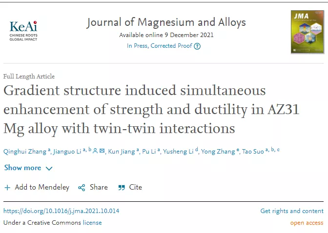 镁合金是一种很有前途的结构材料,由于质量密度低,因此比强度高,可广泛应用于现代工业。然而,镁合金(六方密堆积(HCP)晶格结构)相对较低的屈服强度和较差的延展性成为其在实际工程中广泛应用的限制因素。从文献中可以看出,对于多晶材料,经典的Von Mises判据指出,对于均匀塑性变形,至少需要五个独立的滑移系统,而大多数HCP金属材料无法满足此标准。由于各种滑动系统的临界解析剪切应力 (CRSS) 存在巨大差异,因此无法同时操作足够的滑动系统以保持良好的塑性行为。同时,主要滑移系统和孪生系统之间CRSS值的严重区别也可能使此类合金的变形机制复杂化。先前的研究一致表明,对于Mg及其合金,HCP晶格a轴方向的基底滑移最容易被激活,因为它们的CRSS值较低,而当施加应力沿c轴方向时,非基底滑移和金字塔孪晶也发生以适应塑性变形。特别是,虽然这些孪晶有利于延展性,但相对较低的孪晶应力只会导致非常低的屈服强度。为了满足工业对材料性能的要求,进一步拓宽镁合金的工程应用,强度和延展性成为必须妥善解决的两个关键问题。因此,提高镁合金的力学性能一直是一个持续的焦点话题。