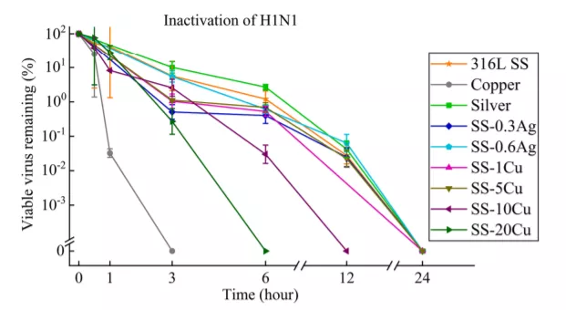 如上图所示,对于新冠病毒,质量分数为20%的铜-不锈钢混合材料,在实验进行6小时后,可见病毒下降到不足0.01%,实现了对99.99%新冠病毒的灭活。