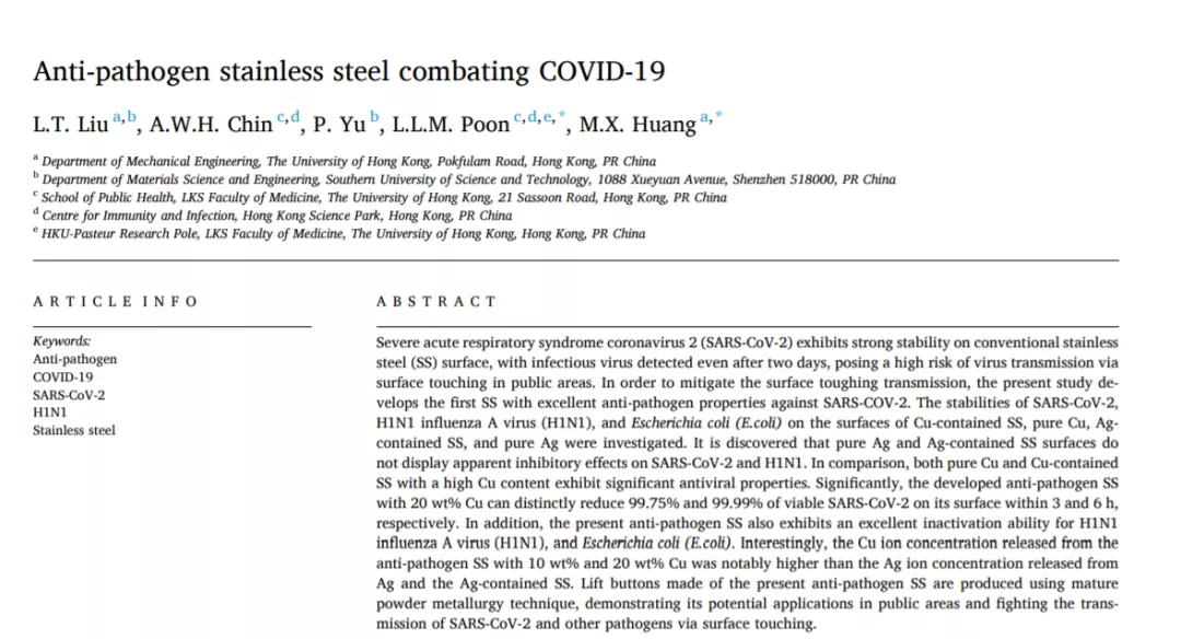 这一成果于11月25日在《化学工程》学术期刊上(Chemical Engineering Journal)发表,论文题为『可抗击新冠病毒的抗病原体不锈钢』(“Anti-pathogen stainless steel combating COVID-19”)。