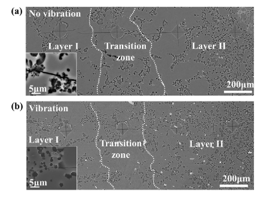 图3:Mg/Al双金属界面的光学形貌:(a)无振动;(b)与振动。