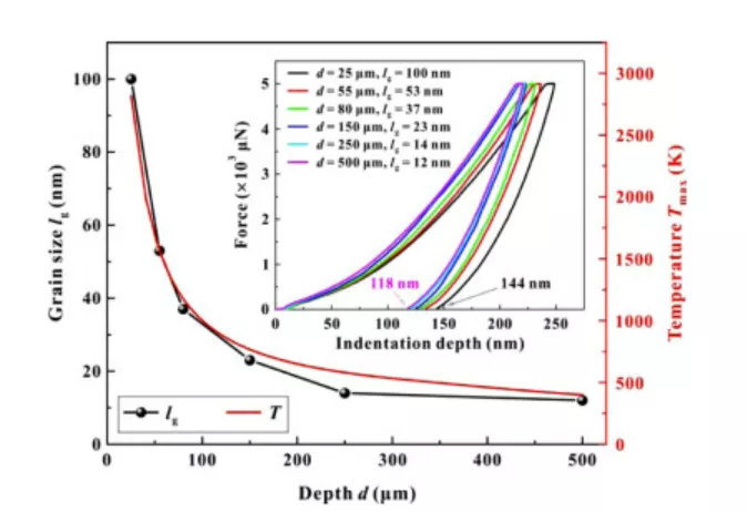 图 4 沿深度的平均晶粒尺寸和最高温度的变化。插图显示了与深度相关的纳米压痕载荷-深度曲线。