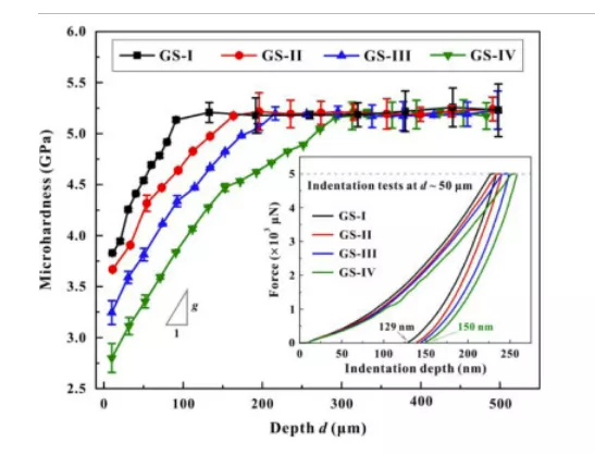 图 2 显微硬度随深度的变化。插图显示了顶部~ 50 μm深度的梯度结构(GS)试样的纳米压痕载荷-深度曲线。