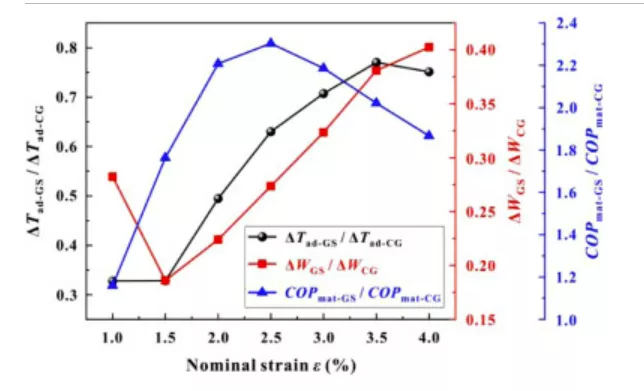 图 9。梯度结构 (GS) 和均匀粗晶 (CG) NiTi 之间的弹热冷却性能比较。