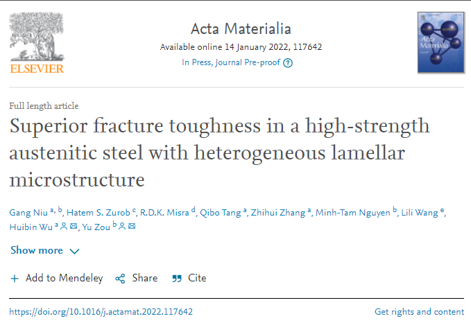 在这项研究中,北京科技大学钢铁技术协同创新中心武会宾教授联合加拿大多伦多大学邹宇教授等人通过结合冷轧、闪光退火和回火工艺,在具有相对薄弱层状界面的低成本奥氏体不锈钢中制备了异质层状显微组织。实现了高断裂韧性(129 MPa m)、高强度(~1.5 GPa 屈服强度)和高延展性(~37% 均匀伸长率)奥氏体不锈钢。研究了这种奥氏体不锈钢的显微组织特征和力学性能;对其断裂行为和增韧机制进行了讨论。相关研究成果以题“Superior fracture toughness in a high-strength austenitic steel with heterogeneous lamellar microstructure”发表再金属顶刊Acta materialia上。