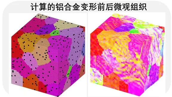 通过介观-宏观尺度的数字孪生仿真(图3),可以看到:铝合金的损伤在介观尺度表现为带状组织形貌,而该形貌主要是由材料内部析出和第二相硬颗粒导致的。图6给出变形微观组织对应的实验测量和计算结果对比。计算表明,第二相颗粒会增加介观尺度的变形非均匀性,从而产生带状组织。