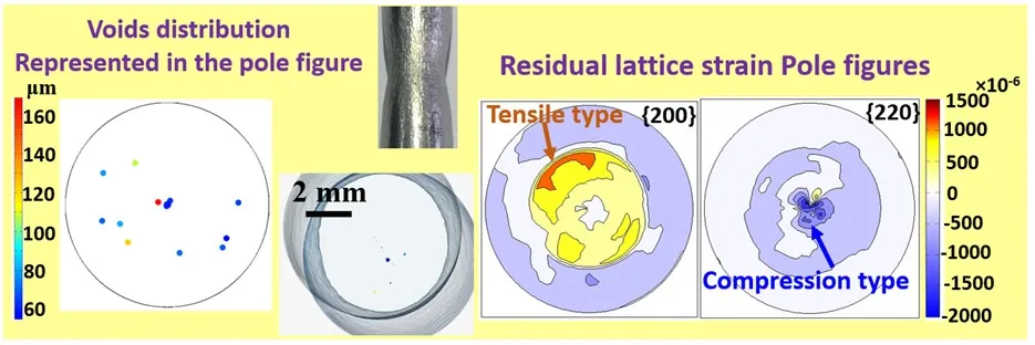 同时,试样缩颈失效后,表面看不到任何孔隙。通过CT测量表明,微孔隙都在材料的内部。如果以试样中心建立笛卡尔坐标系,把孔隙在三维空间的分布按极图的方式投影,发现孔隙的三维空间分布和残余点阵应变分布非常类似,如图2所示。这里,残余点阵应变也表达在极图中。可以看到心部对应沿着轴向的压缩残余应变,而其它孔隙对应拉伸残余点阵应变。该规律的详细机理解释见参考文献1。