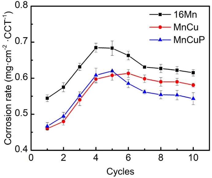 图1. MnCuP耐候钢、MnCu耐候钢与16Mn钢在大气腐蚀初期的腐蚀速率演变规律