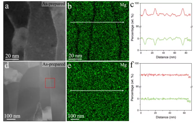 图4所示为所制备的纳米晶粒结构在深度为7 μm处的HAADF-STEM图像(a)和元素映射(b);(c) 沿 (b) 中的白色箭头对 Al 和 Mg 浓度进行线扫描,显示晶界处明显的 Mg 耗尽;所制备的亚微米的 HAADF-STEM 图像 (d) 和在深度为95μm颗粒结构的元素映射 (e) ;(f) 沿 (e) 中的白色箭头对 Al 和 Mg 浓度进行线扫描。