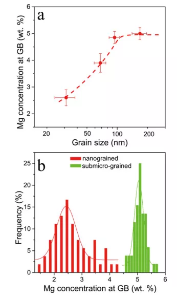 图5所示为(a)GBs 处 Mg 浓度随所制备样品中晶粒尺寸的变化;(b)在制备的纳米晶粒和亚微米晶粒样品中的随机晶界中,Mg消耗的晶界处的Mg浓度的统计分布。