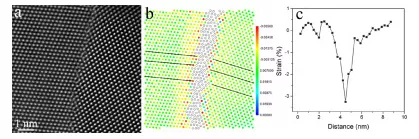 图11所示为所制备的纳米晶Al-5Mg 合金晶界的晶格应变分析:(a)Σ9晶界的高分辨率 HAADF-STEM 图像,光束沿<110>方向;(b)使用LADIA程序定量分析边界附近的晶格应变分布;(c)沿(b)所示黑线从三组数据中平均测量的跨边界晶格应变,在边界附近显示出明显的压缩应变。