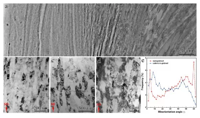 图1所示为制备的SMGT的组织和取向角分布Al-Mg试样:(a) SMGT Al-5Mg试样的典型SEM剖面图;亮场透射电镜图像显示了地下不同深度的显微组织处理表面:(b) 7μm,(c) 95μm,(d) 150μm;箭头表示剪切方向;(e)纳米粒和纳米粒取向角分布比较深度分别为7μm和95μm的Al-5Mg晶粒。