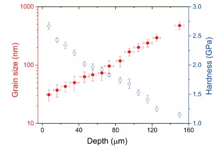 图2所示为所制备的 SMGT Al-5Mg 样品的横向晶粒尺寸和维氏硬度随表面深度的变化。
