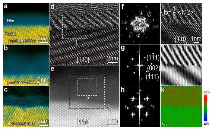 图 5:钝化膜引起的钝化改性。a - c表面膜上的跨钝化诱导结晶度。沿奥氏体基体 [110] 轴的高分辨率 HAADF-STEM 图像显示在 0.5 mol L -1 H 2 SO 4电解质中阳极形成的钝化膜 ( a , b ) 几乎是无定形的,具有一些结晶成分,而跨钝化膜薄膜 ( c ) 是高度结晶的。透明薄膜中的原子柱是不同的。d - h高结晶度的透明薄膜在单晶基体上外延生长。HRTEM 图像 ( d ) 和高分辨率 HAADF-STEM 图像 ( e),沿着奥氏体基体的 [110] 轴,显示了透明薄膜中明显的晶格条纹和原子柱。对应于区域 1 的快速傅里叶变换 (FFT) 图像,包括薄膜和矩阵 ( f ),区域 2 包括跨无源薄膜 ( g ),以及区域 3 ( h ),说明两相具有明确定义的外延取向关系。fcc 结构的透钝膜的晶格参数确定为 0.43 nm,这与晶格参数为 0.36 nm 的 FeCr15Ni15 奥氏体基体不匹配。i沿 [110]矩阵方向拍摄的 HRTEM 图像显示了大量失配位错,Burgers 矢量为b?= 1/6 < 112> 在金属/透明薄膜 (Me/TF) 的界面。j基于 (002) 平面的i的IFFT(快速傅里叶逆变换)图像,显示沿界面的周期性位错阵列。k Me/TF 界面上的几何相分析 (GPA) 显示位错核心处的巨大应变。