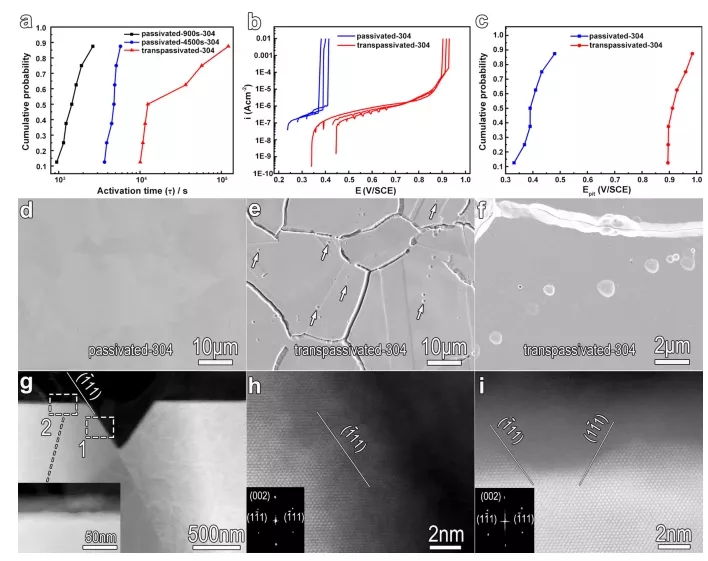在本工作中,中科院金属研究所马秀良课题组将1.1 V/SCE的极正电位应用于钝化的FeCr15Ni15单晶合金和商用304不锈钢的传递区,获得了波动的Me/F界面,其中金属是由大量封闭的{111}。我们发现的钝化膜的抗还原溶解以及点状腐蚀得以改善,扩大了钝化膜的激活时间(T)硫酸两个数量级。因此,我们提出了一种高效和低成本的结晶学工程程序,以增强金属的耐蚀性。相关研究成果以题“Enhanced corrosion resistance by engineering crystallography on metals”发表在国际著名期刊 Nature Communications上。