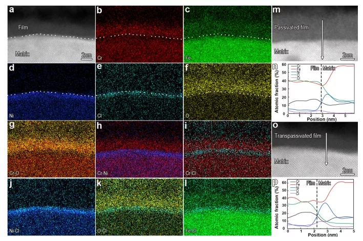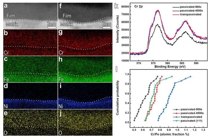 图 6:TEM 和 XPS 分析中的 Super-X EDS 映射显示,在 1.1 V/SCE 下的跨钝化诱导增强的 Cr 富集,而跨钝化膜和钝化膜中的 Cr 化合价相同。a - e钝化膜的高分辨率 HAADF-STEM 图像 ( a ) 和相应的元素图 ( b - e )。f – j透明膜 ( f )的高分辨率 HAADF-STEM 图像和相应的元素图 ( g – j )。