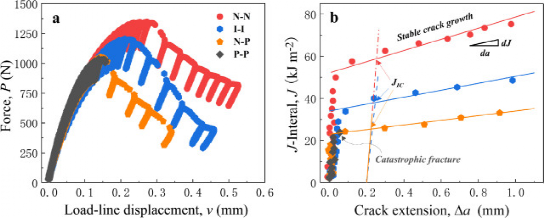图 3.(a) 不同方向的力与载荷线位移曲线。应用卸载顺应性技术来确定瞬时裂纹长度。(b) J积分的变化作为根据(a)中的数据计算的裂纹延伸的函数。