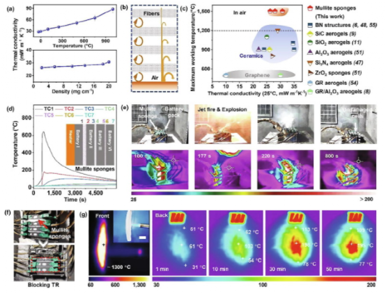 图 5。莫来石海绵的隔热。(a)热导率 与温度或体积密度的关系。(b) 层状海绵中逐层阻气效应、多层漫反射效应和热桥抑制效应的示意图。(c) 不同弹性绝缘子的导热系数和最高工作温度的比较。缩写:GR = 石墨烯;λ空气 = 空气的热导率。(d) 4 电池模块上的温度响应过热引起的热失控(TR) 传播测试。图例中的 TC 表示热电偶并且它们的下标可以在插图中引用。(插图)TR 传播测试设置。(e) TR 传播测试期间与时间相关的屏幕截图和相应的红外热成像图像。(f) TR 测试前后电池模块的照片,显示莫来石海绵阻挡了 TR 传播。(g)丁烷喷灯燃烧过程中正面的红外图像和背面的时间相关红外图像。(插图)通过丁烷喷灯燃烧的绝缘测量设置。比例尺,1 厘米。