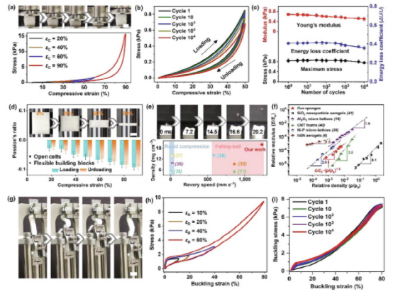 图 3。莫来石海绵的弹性柔韧性。(a) 一个完整周期的快照,具有 90% 的压缩应变 (εC )和随着εC幅度增加的应力-应变曲线。比例尺,0.5 毫米。(b) 10,000 次循环压缩试验,ε C为 50%。(c)储能模量、损耗模量和阻尼比的循环依赖性。(d) 泊松比与压缩应变。构建块的灵活性和开孔结构导致泊松比接近于零。 (e) 海绵弹回钢球的快照以及现有材料的恢复速度与密度的比较。比例尺,5 毫米。图表中的数字代表相关参考。(f) 相对杨氏模量与其他轻质结构的比较。(g) 一个屈曲循环的照片,ε B为 80%。(h) 随着屈曲应变 (εB) 幅度增加的工程应力-应变曲线。(i) ε B为 80%的10,000 次循环屈曲疲劳试验。