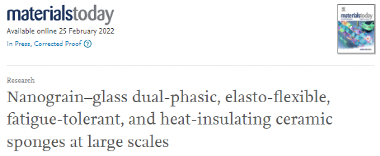 清华大学材料科学与工程学院联合北京大学通过构建块的纳米颗粒-玻璃双相结构证明了宏观陶瓷的超弹性和柔韧性。制备的陶瓷海绵同时具有超轻、弹性和隔热性,并且可以以接近零的泊松比从大变形中完全恢复。这些海绵状材料还具有极好的抗疲劳性在 10,000 次大规模压缩或屈曲循环中没有累积损坏或结构倒塌。我们证明了纳米颗粒-玻璃双相的弹性变形和开孔三维结构中的纤维膨胀实现了卓越的灵活性。此外,这些海绵材料具有从深低温(-196°C)到高温(1500°C)的优异的不随温度变化的超弹性。陶瓷系统的灵活性源于包裹纳米颗粒作为增强材料的延展性玻璃状脉。这些双相陶瓷海绵具有卓越的性能,例如重量轻、超弹性、耐疲劳、泊松比接近于零,并且在极宽的温度范围内具有超低的导热率。此外,我们在此展示了陶瓷海绵材料可以轻松放大,因此可以广泛用于广泛的应用,例如防火、红外阻尼和太空探索。 这种用于纳米颗粒-玻璃双相陶瓷的合成技术也可以扩展到其他陶瓷系统,以扩大其在必须具有材料灵活性的应用中的潜力。相关研究成果以题“Nanograin–glass dual-phasic, elasto-flexible, fatigue-tolerant, and heat-insulating ceramic sponges at large scales”发表在国际著名期刊 Materials Today上。