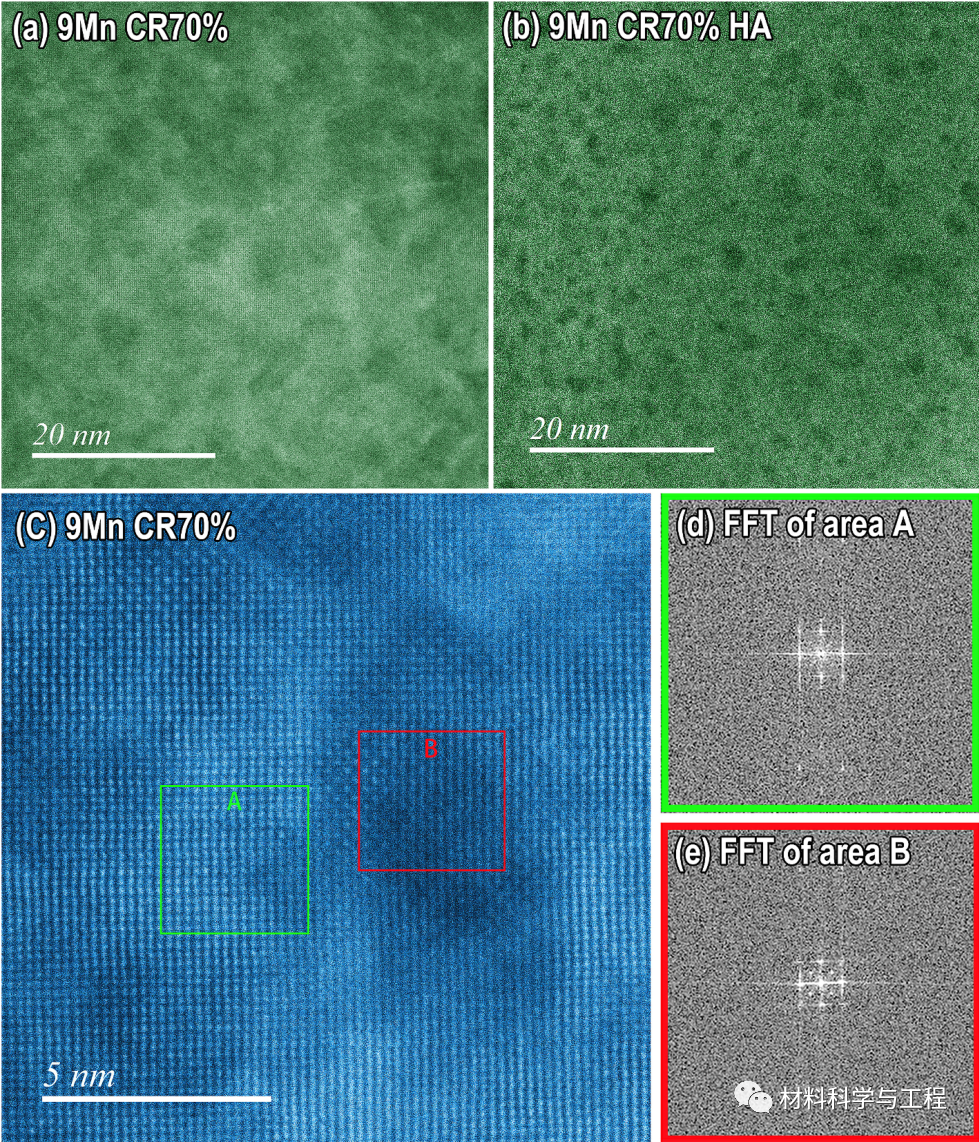 图6 (a,c)9Mn CR70%和(b)9MnCR70%HA样本的高角环形暗场像(HADDF)。(c)从[001]带轴拍摄的高角环形暗场像显示(d)基体和(e)B2析出物的快速傅里叶变换(FFT)。