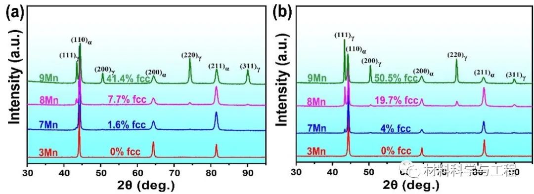 研究发现对于固溶(SS)淬火后的时效(软态时效,SA),要实现体心立方基体中B2的析出,奥氏体相的含量应小于体心立方相分数。对于奥氏体体积分数大于50%的9Mn合金,软态时效过程中奥氏体逆转变阻碍B2的析出,图7显示DSC分析的放热峰和吸热峰分别对应于B2析出和奥氏体回复,9Mn SS样品两个峰重叠,导致几乎没有沉淀硬化效应,导致软态时效强度较低。冷轧过程中储存的晶体缺陷增强了B2析出,导致9Mn HA样品的析出强化效果显著。从而获得了超高的极限强度(~1600 MPa),拉伸塑性(~7%)比软态时效合金(~1450 MPa和~5%)有所提高。这项工作表明,通过添加锰和硬态时效来提高超高强度钢的塑性是一种比较有前景的策略。