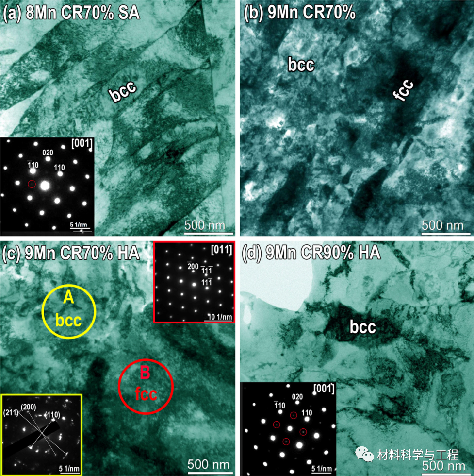 图5 8MnSA,9Mn CR70%,9Mn CR70%HA和9Mn CR90% HA试样的明场像(BF-TEM)及相应选区电子衍射(SAED)。