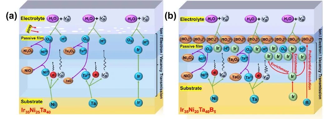 另外,研究发现微量添加类金属B元素可以显著提高Ir-Ni-Ta非晶合金的耐蚀性,Ir-Ni-Ta-B样品钝化电流要比Ir-Ni-Ta样品降低了一个数量级。在Ir-Ni-Ta和Ir-Ni-Ta-B非晶合金表面形成的钝化膜具有几乎相同的成分,但具有不同的厚度和孔密度。这些差异是由添加B引起的,B促进钝化膜的快速形成,同时抑制活性金属的溶解。金属Ir的表面富集和[BO3]3-的吸附进一步提高了Ir-Ni-Ta-B非晶合金的耐蚀性。