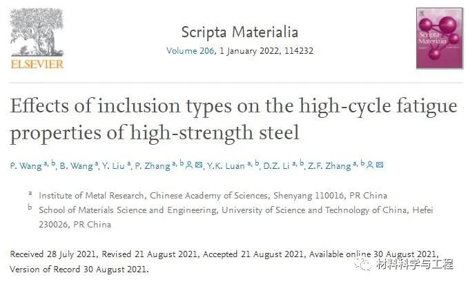 中科院金属研究所张哲峰团队探讨了不同类型夹杂物对高强钢高周疲劳断裂行为的影响,明确了不同夹杂物引起疲劳开裂的模式。相关论文以题为“Effects of inclusion types on the high-cycle fatigue properties of high-strength steel”发表在Scripta Materialia。