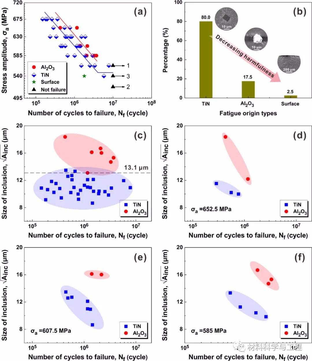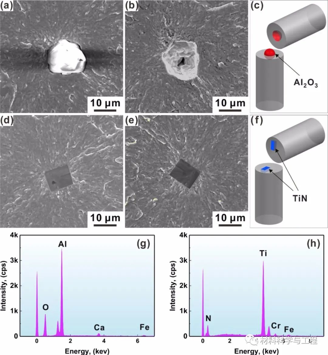 研究发现大多数试样,疲劳裂纹主要来源于夹杂物,疲劳失效源的夹杂物主要是氮化物(TiN)和氧化物(Al2O3),应力比R=0.1时的疲劳极限为547MPa。统计结果显示,80%的裂纹由TiN引起,17.5%裂纹由Al2O3引起。TiN引起裂纹的夹杂物尺寸为9-14μm,远小于Al2O3的15-19μm,说明即使TiN的夹杂物尺寸小于Al2O3,仍能引发轴承钢的疲劳裂纹,这与一般高强钢疲劳裂纹主要来源于最大夹杂物尺寸的报道不一致,随着夹杂物尺寸的减小,Al2O3引起疲劳破坏的次数显著增加,而TiN在不同循环应力幅值下的疲劳寿命数据具有较大的弥散性。